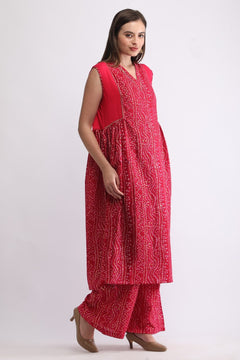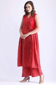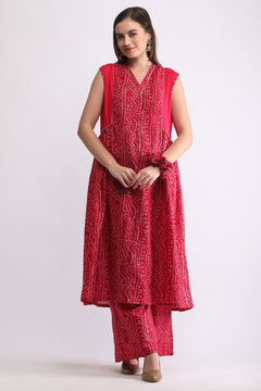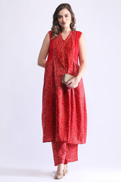 This elegant Bandhani Printed Kurta Set is a perfect blend of traditional artistry and contemporary style. Crafted from soft, breathable cotton fabric, the outfit features a sleeveless A-line kurta adorned with an intricate Bandhani tie-dye pattern in white across the length, creating a vibrant ethnic look.