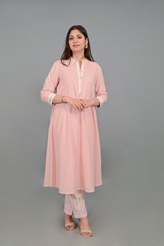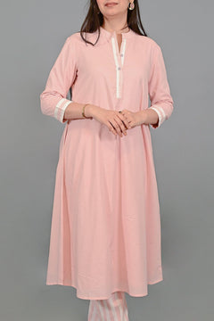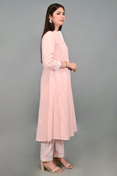 Embrace understated elegance with the Blush Breeze Kurta Set, crafted from soft cotton for breathable comfort. The A-line kurta features a gracefully flared hem, a mandarin collar with a short button placket, and subtle white piping along the placket and sleeve cuffs, adding delicate contrast. Three-quarter sleeves and calf-length side slits ensure ease of movement and a refined silhouette. Paired with straight-cut trousers in matching blush tones with white vertical stripes, the ankle-length pants offer a relaxed fit with a partially elasticated waistband for comfort. Perfect for casual outings, festive gatherings, or daytime events, this set combines timeless tradition with modern ease.