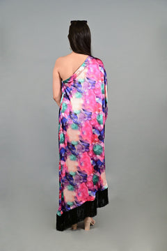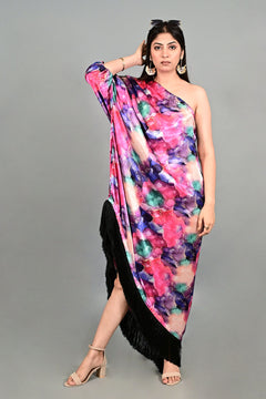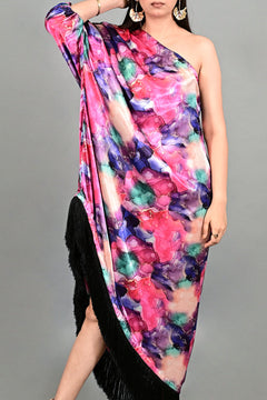 Make a statement with the Boho Mirage One-Shoulder Flowy Dress, crafted from lightweight satin for a soft, fluid drape that flatters every silhouette. Featuring a chic one-shoulder sleeve design, this dress exudes effortless elegance with a touch of bohemian charm. The watercolor abstract floral print combines cool and warm tones in a marbled, artistic blend, creating an eye-catching visual appeal. The hemline is finished with a contrasting black fringe border, adding dramatic movement with every step. Perfect for evening soirées, festive events, or resort occasions, this dress balances bold artistry with breathable comfort, making it a standout piece for any wardrobe.