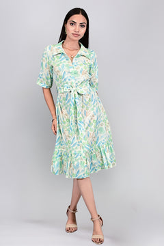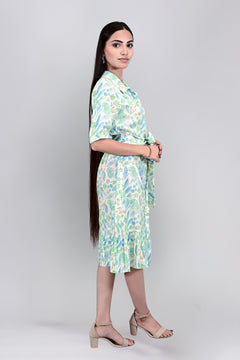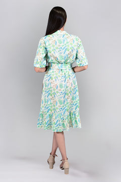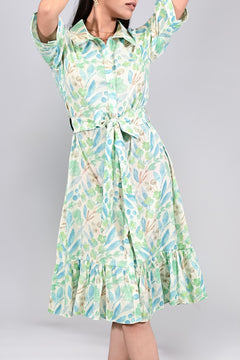 Embrace effortless elegance with the Botanica Breeze Shirt Dress, crafted from breathable cotton slub. Featuring a soft mint and pastel green leaf print on a soothing cream base, this versatile piece blends nature-inspired charm with everyday comfort. The flared bottom with a gentle frill adds a playful touch, while the matching fabric belt allows you to define your waist. Wear it as a breezy dress or layer it open over a tank and jeans for a chic, laid-back look. Perfect for brunches, vacations, or sunny strolls.