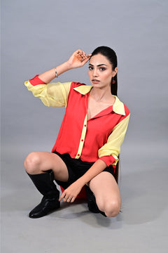 Make a striking style statement with our Crimson Pop Contrast Shirt with Black Shorts, a perfect blend of bold color and modern tailoring. Crafted in airy georgette, the shirt features a vibrant crimson red and pale yellow color block design with a front button closure on a contrasting yellow placket. The long sleeves, designed with a yellow base and crimson cuffs, can be rolled up for a chic casual vibe. An asymmetrical high-low hemline at the back adds movement and flair. Paired with high-waisted cotton denim black shorts, this look balances vibrant energy with sleek minimalism.