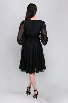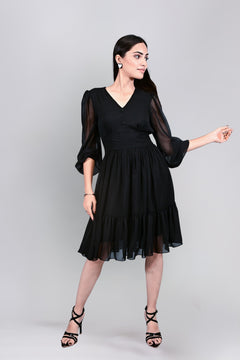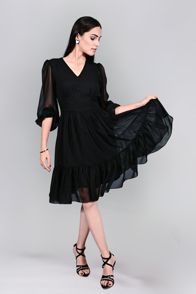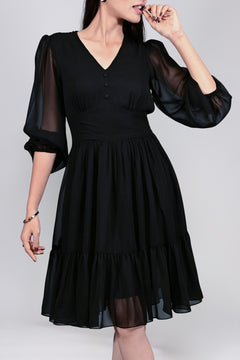Elevate your wardrobe with the Georgette Puff Sleeves Fit and Flare Midi Black Dress, a timeless piece crafted in lightweight georgette. Featuring a flattering V-neckline with three delicate fabric-covered buttons, this dress blends classic elegance with modern charm. The semi-sheer balloon sleeves add soft drama, finished with gathered cuffs for a refined touch. A fitted waist flows into a relaxed, gathered skirt, while the asymmetric flounce hemline brings graceful movement. Perfect for both day and night, this dress is your go-to for effortless sophistication and style.