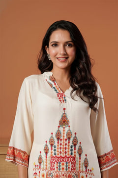 Add timeless elegance to your wardrobe with this ivory kurti pant co-ord set, featuring beautiful traditional-inspired prints in warm festive tones. Crafted from soft, breathable fabric, the kurti showcases a flattering neckline, three-quarter sleeves, and intricate border detailing that enhances its ethnic charm. Paired with matching straight pants, this set offers effortless comfort and a graceful silhouette. Perfect for festive gatherings, casual outings, or elegant daytime wear, it blends tradition with modern ease beautifully.