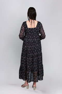 - A voluminous flared maxi dress in a black base adorned with delicate micro floral prints in soft pink, white, and lavender.