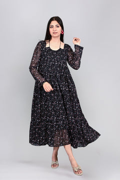 The Midnight Bloom Flare Dress is a breezy, voluminous maxi crafted from soft georgette, perfect for effortless elegance. Set on a classic black base, it features delicate micro floral prints in shades of pink, white, and lavender. Gathered tiers add graceful movement and flow, while the relaxed, oversized flare fit ensures all-day comfort. Ideal for casual outings or evening strolls, this dress blends comfort with charm. Care: Gentle machine wash or hand wash to maintain the fabric and floral detailing.