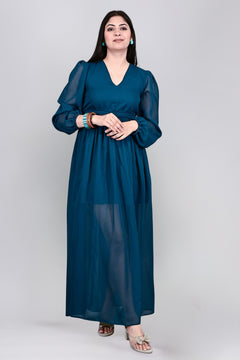 The Midnight Teal Sheer Maxi Dress is a graceful full-length ensemble crafted from flowy georgette. Featuring a subtle V-neckline and sheer balloon sleeves, it offers an elegant yet ethereal charm. The high-waisted silhouette is enhanced with delicate pleats, creating a flattering fit. A thigh-high slit on the flowing A-line skirt adds a hint of allure, while the sheer overlay elevates its sophistication. Ideal for evening occasions. Gentle machine wash or hand wash to maintain its fabric and structure.