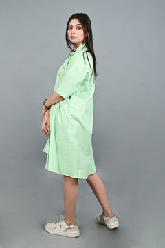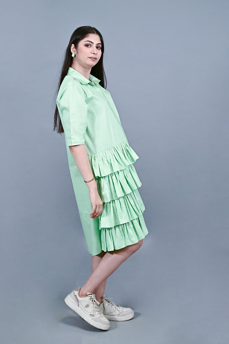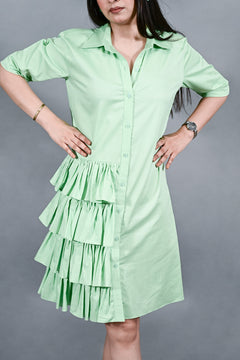 Bring playful charm to your wardrobe with the Mint Ruffle Pop Shirt Dress, a refreshing take on contemporary fashion. Crafted from breathable glace cotton, this mint green dress offers both comfort and style. The button-down front with a classic collar and elbow-length sleeves keeps the look smart and versatile. Its highlight is the asymmetrical triple-tiered ruffle panel on one side of the skirt, adding a quirky, youthful twist to the clean silhouette. Designed with a relaxed, straight fit, this dress is effortlessly chic — perfect for brunches, day outings, or casual gatherings where style meets comfort.