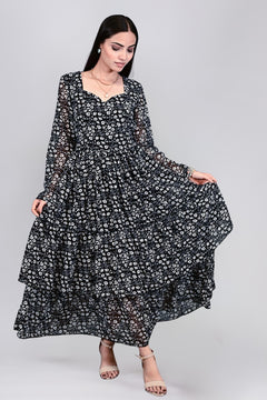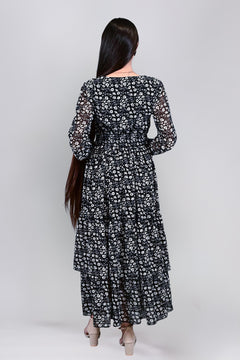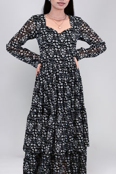 - A black flowy maxi dress adorned with delicate white floral prints, giving a perfect blend of elegance and everyday charm.