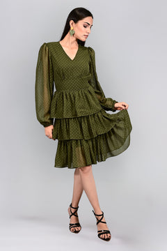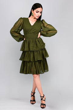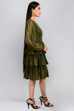 The Olive Whisper Tiered Dress is crafted in soft georgette with a flattering V-neckline and full-length balloon sleeves. Its cinched waist enhances the silhouette, while tiered layers add graceful movement. Romantic and refined, it's perfect for day or evening wear. Gentle machine wash or hand wash recommended.