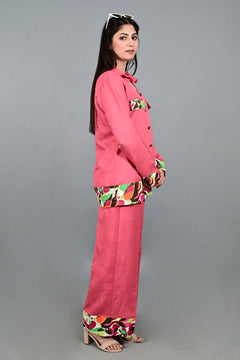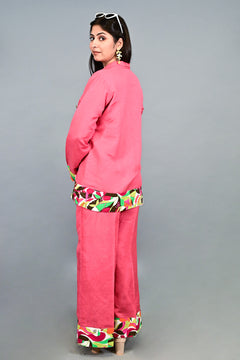 Step out in playful sophistication with the Pop Fusion Co-ord Set, crafted from a soft cotton blend for breathable comfort. The long-sleeved, collared shirt features a front button closure with stylish wooden-style buttons, flap pockets, and vibrant contrast patchwork details on the pockets, cuffs, and hemline, adding a pop of artistic charm. Paired with straight-fit pants featuring matching printed accents at the cuffs and a comfortable relaxed waistband, this two-piece set balances style and ease effortlessly. Perfect for casual outings, brunches, or daytime events, it combines contemporary design with artisanal detailing for a versatile, standout ensemble.