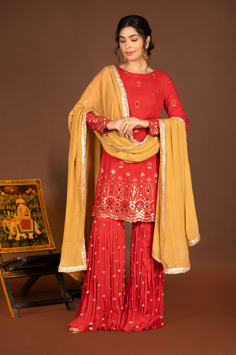 Red Embroidered Kurta with Garara and Rust Gold Dupatta