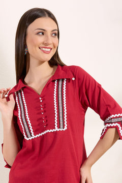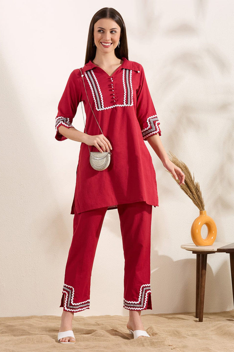 Add timeless elegance to your wardrobe with this red kurti pant co-ord set, designed for comfort and refined style. Crafted from soft, breathable fabric, the kurti features a smart collar neckline with contrast embroidery and delicate button detailing. Paired with matching straight pants, this set is perfect for office wear, casual outings, and elegant day occasions.