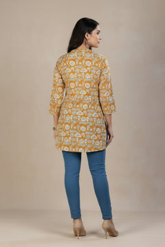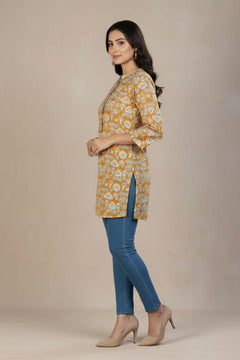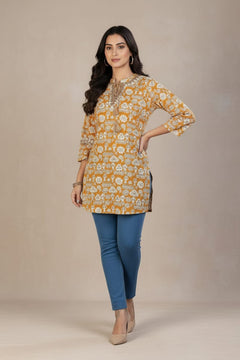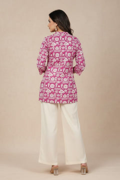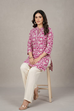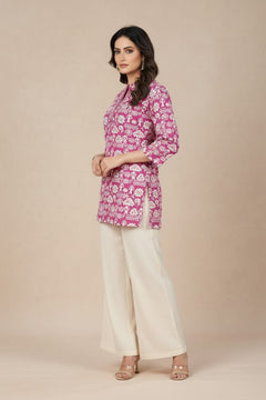 Add playful elegance to your everyday look with this women’s pink printed short kurti. Designed with traditional-inspired motifs and a stylish collar neckline featuring delicate multi-work detailing, it offers a flattering straight fit with three-quarter sleeves. Crafted from soft, breathable fabric, it ensures all-day comfort and pairs effortlessly with jeans, trousers, or ethnic bottoms.