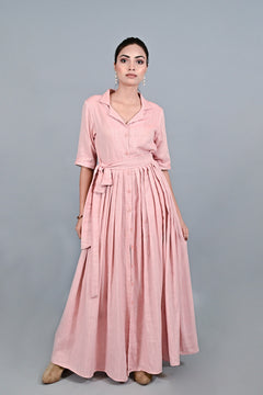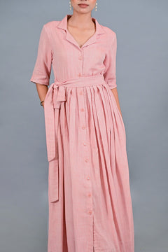 Elevate your style with the Rosewood Slit Shirt Dress, a perfect blend of structure and femininity. Crafted from a soft cotton blend with a smooth santoon lining, this dusty pink dress offers lightweight comfort with natural elegance. The lapel collar and elbow-length sleeves bring a tailored touch, while the button-down front flows into a dramatic thigh-high slit for a modern, statement-making edge. A matching self-fabric tie-up belt cinches the waist, creating a flattering shape that balances sophistication with ease. Finished with a flowing pleated skirt, this versatile piece is ideal for brunches, evening soirees, or chic day events.