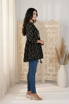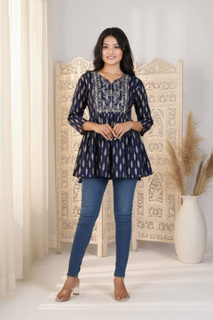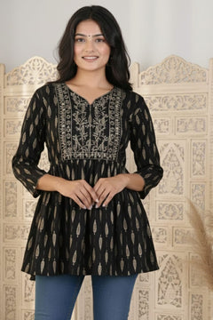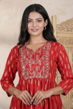 Add a festive charm to your everyday look with this elegant red short kurti, featuring intricate multi zari work and delicate golden motifs on the front. Designed with a gathered yoke and three-quarter sleeves, it offers a flattering, flowy fit. Crafted from soft fabric, it pairs beautifully with jeans, leggings, or straight pants for versatile styling.