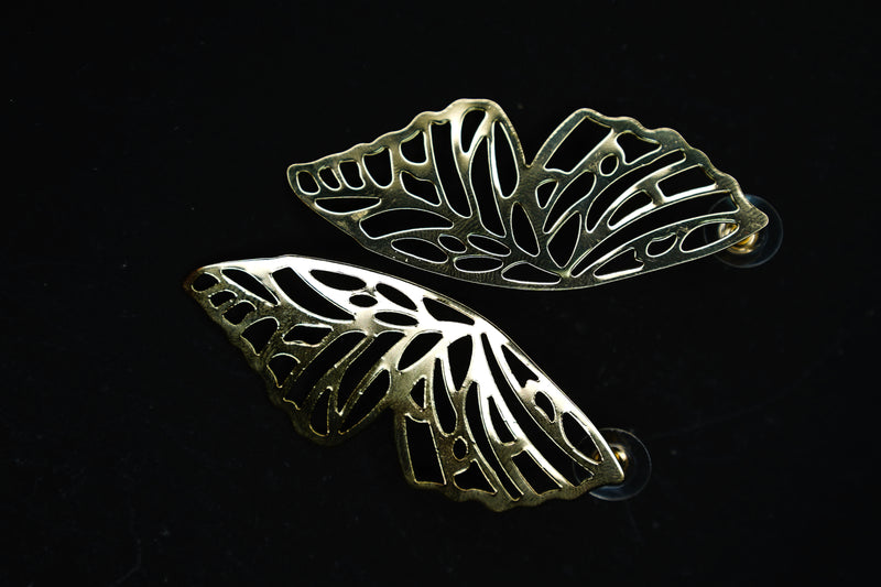 Inspired by the delicate beauty of nature, these wing-shaped statement earrings feature an intricate openwork design in a soft gold-toned finish. The sculptural silhouette creates a sense of movement and lightness, making them a striking yet effortless accessory. Perfect for contemporary styling, these earrings add a touch of artistic elegance to any look.