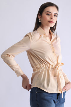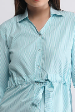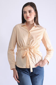 This striped waist-tie shirt is designed for effortless everyday style. Made with soft, breathable fabric, it features fine vertical stripes that give a sleek and elongated look. The front button-down placket adds a classic touch, while the adjustable drawstring at the waist lets you customise the fit—giving a flattering, cinched silhouette. Long sleeves with cuffs enhance the polished feel, making it perfect for casual outings, office wear, or smart day wear. Pair it with denim or trousers for a clean, modern look.