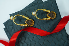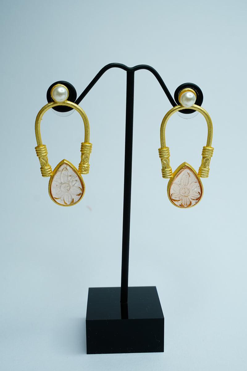 Elegant and timeless, these handcrafted earrings feature a graceful gold-toned arch design paired with delicately carved floral drop stones. Finished with a classic pearl stud, the combination brings together traditional charm and contemporary sophistication. Ideal for festive occasions and refined everyday wear, these earrings add a soft statement of elegance to any look.
