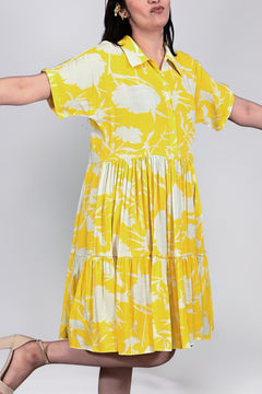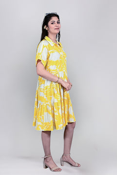 Bask in effortless charm with the Sunlit Bloom Shirt Dress, crafted from airy cotton slub for all-day comfort. Featuring a classic shirt collar and button-down front, it’s designed with short sleeves and a relaxed fit for easy movement. The elasticated waist flatters your figure, while the single-tier flared skirt with gentle gathers adds graceful volume. Adorned with a vibrant floral print, this dress brings a fresh, tropical vibe to your everyday wardrobe-perfect for sunny outings, weekend brunches, or breezy getaways.