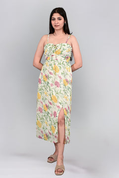 Details about the garments: A graceful sleeveless midi dress with a gathered bust and subtle front slit. This dress features a soft, nature-inspired floral print in yellow, lilac, and green on a warm ivory base. The ruched front neckline and empire waist enhance the feminine silhouette, making it perfect for sun-soaked days.