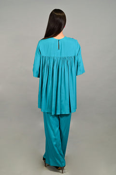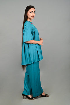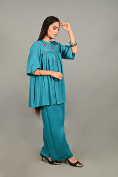 Infuse elegance and comfort into your wardrobe with the Teal Bloom Embroidered Co-ord Set, crafted from soft cotton rayon. The flowy pleated kurta-style top features a rounded neckline with delicate yoke detailing, 3/4th sleeves, and intricate floral embroidery in pink and green, creating a feminine, artisanal touch. Front pleats enhance the soft drape, while the mid-thigh tunic length ensures a flattering, versatile silhouette. Paired with full-length straight-fit pants with a partially elasticated waistband, the set offers effortless comfort without compromising style. Ideal for festive occasions, casual outings, or daytime celebrations, this co-ord set blends traditional charm with contemporary elegance.