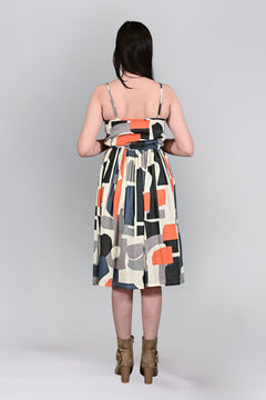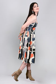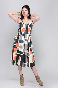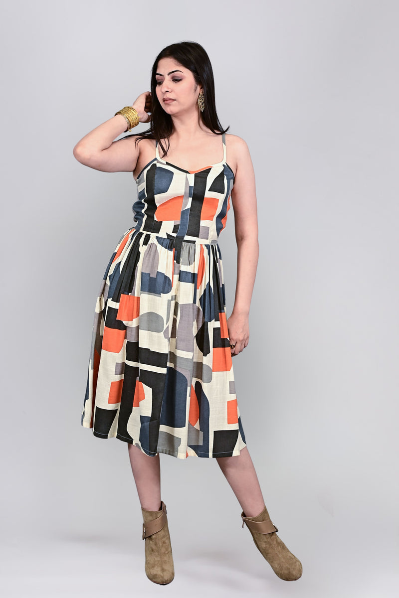 Unleash your bold side with the Urban Muse Geometric Spaghetti Dress, crafted from breathable cotton slub for all-day comfort. Featuring a sweetheart neckline and a structured bodice, this dress flatters with slim, adjustable spaghetti straps and a defined waistline. The pleated, flowy skirt moves effortlessly, adding a sense of freedom and grace. Adorned with an all-over modern geometric print, it brings an artsy edge to your wardrobe. With a chic mid-length hem, it's perfect for casual outings, vacations, or stylish workspaces that embrace creativity.